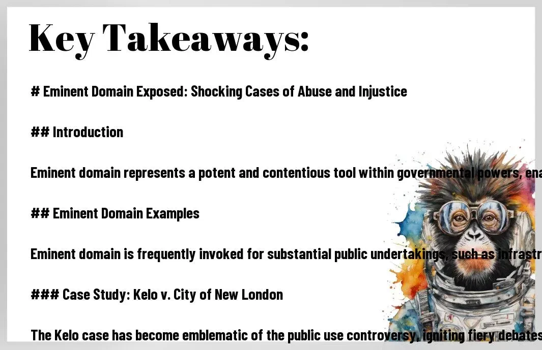 - Worst Domain Abuses: Eminent domain abuses can take many forms, including insufficient compensation, discriminatory practices, and false claims of blight, as seen in the Las Vegas Widow and Bruce Family in California cases.